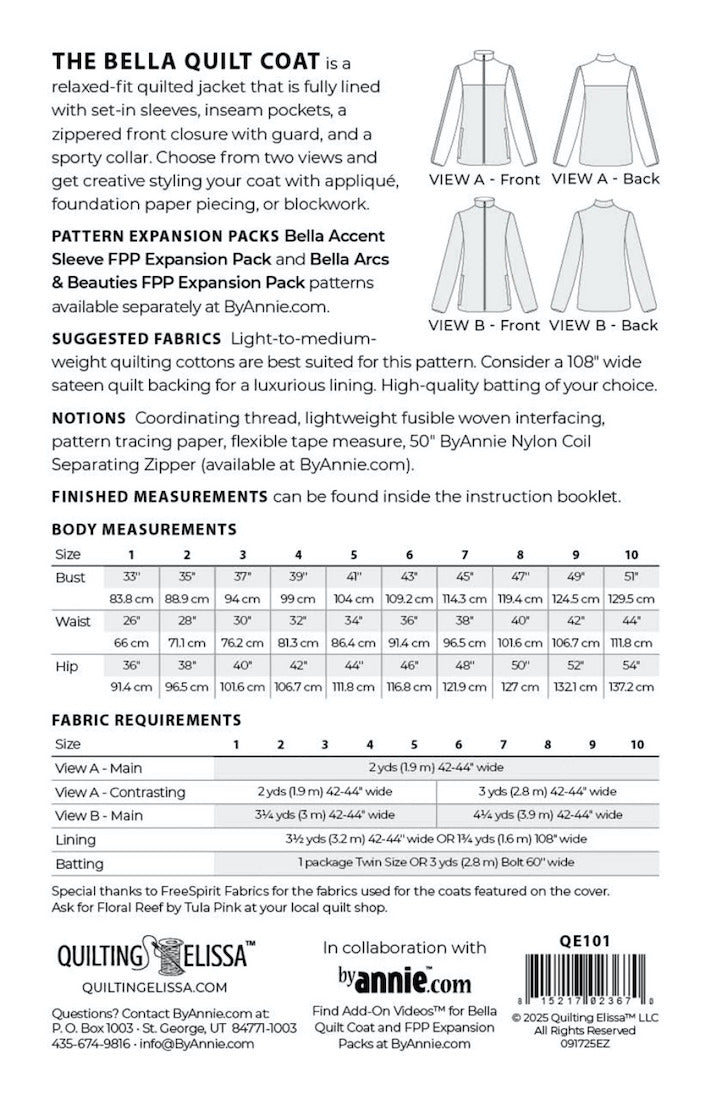 Bella Quilt Coat by ByAnnie Sizes: 1-10. Skill level: Suitable for the adventurous beginner/intermediate sewist. This relaxed fit quilted jacket is available in ten sizes. It is fully lined and features set-in sleeves, inseam pockets, a zippered front closure with guard, and a sporty collar that is stylish and functional. QE101