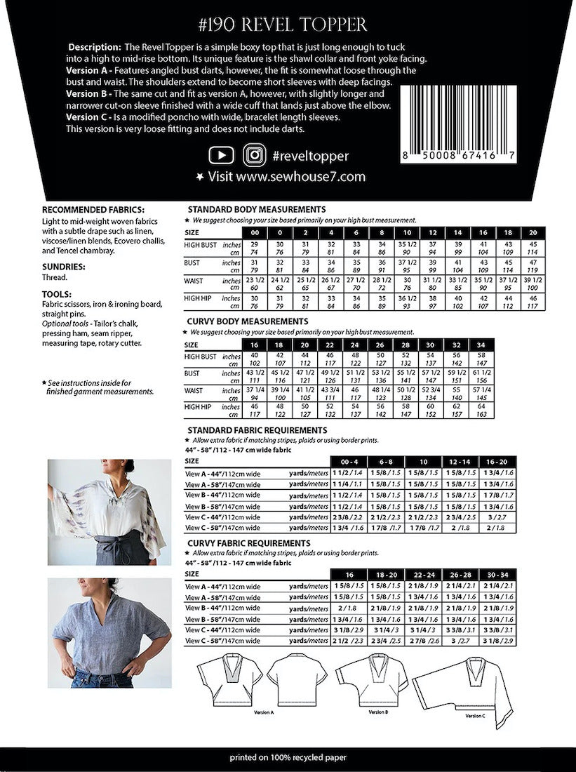 Skill Level: Confident Beginner. The Revel Topper is a simple boxy top that is just long enough to tuck into a high to mid-rise bottom. Its unique feature is the shawl collar and front yoke facing.